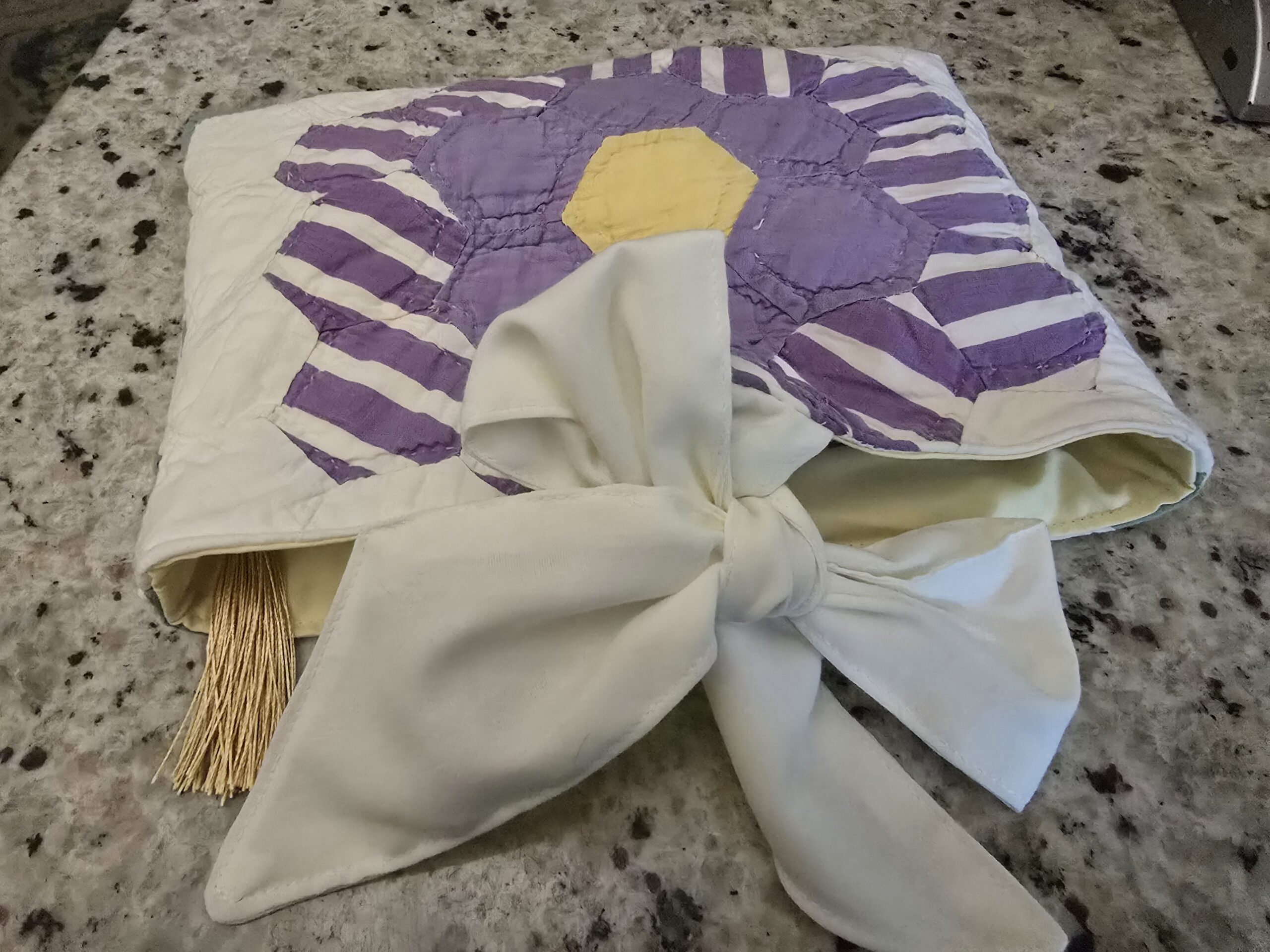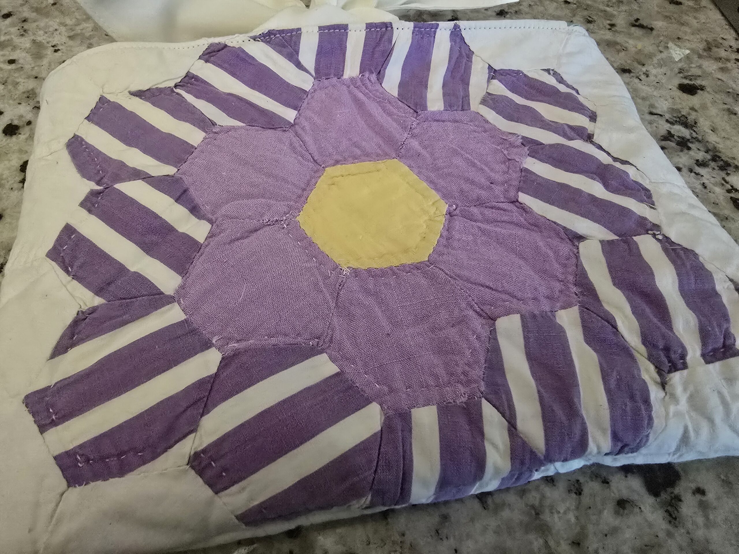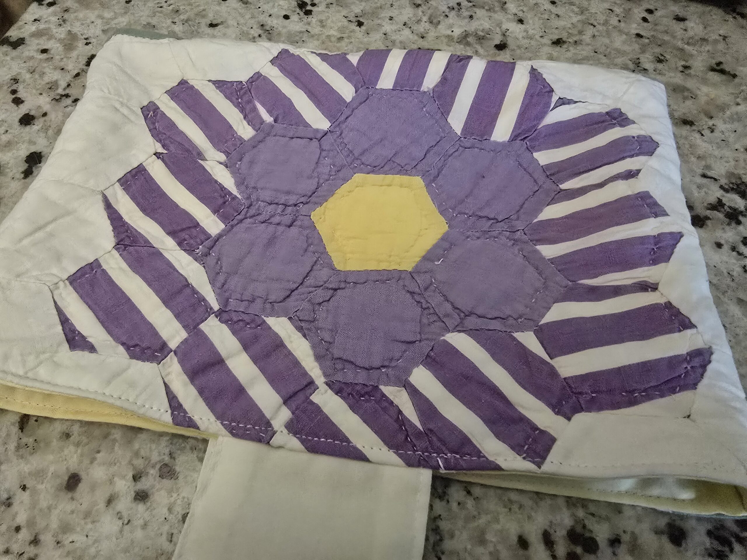 • Eye-catching quilt-flower design in lavender, white striping, and a sunny yellow center