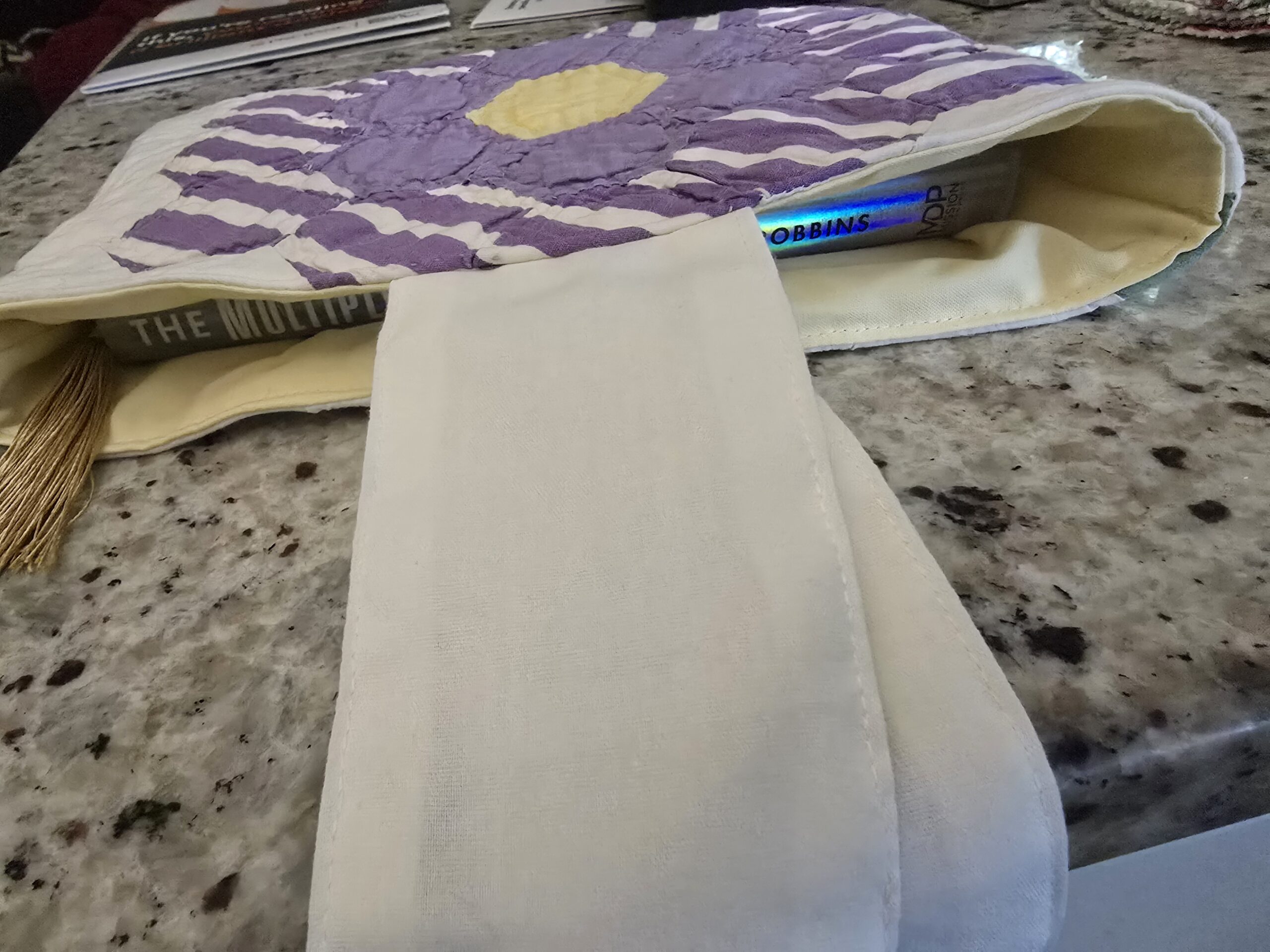 Give your favorite reads a cozy, stylish home with this beautifully handcrafted book sleeve made from a repurposed vintage quilt. Each sleeve is truly one-of-a-kind, featuring the original quilt’s charming purple, white, and yellow floral patchwork—full of character, history, and the soft, well-loved texture only vintage textiles can offer.