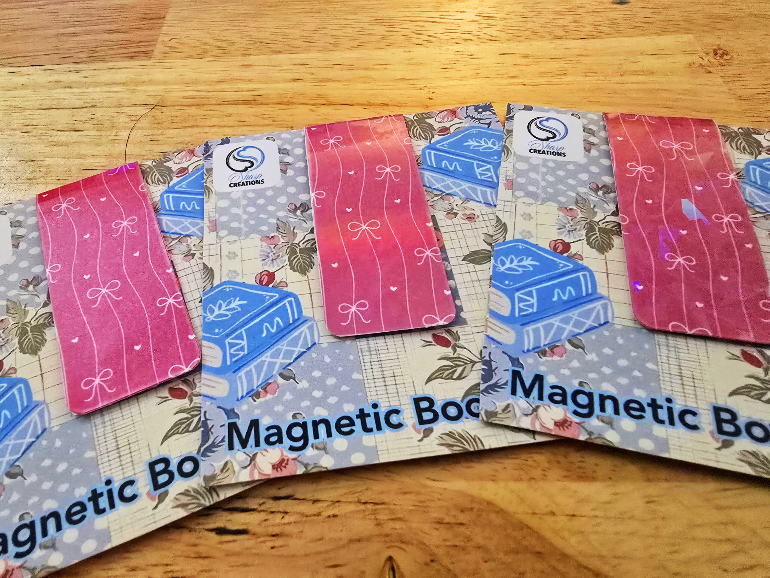 Keep your place in style with these charming pink bow magnetic bookmarks. Featuring a vibrant pink design accented with delicate white bows and tiny hearts, these bookmarks add a cheerful pop of color to any book or planner.